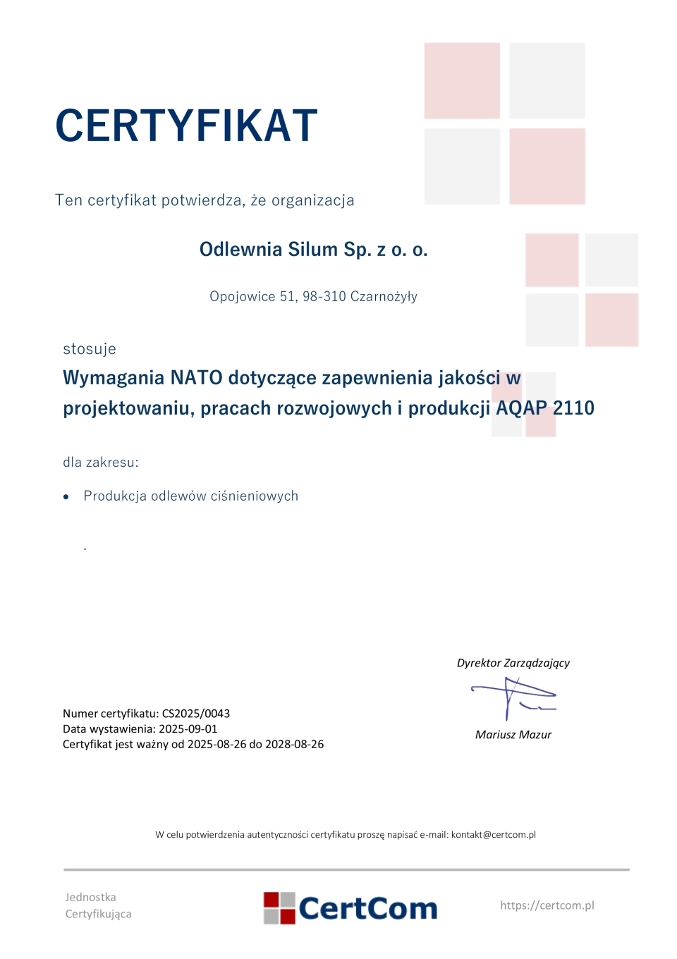 Certyfikat AQAP 2110 - Odlewnia SILUM