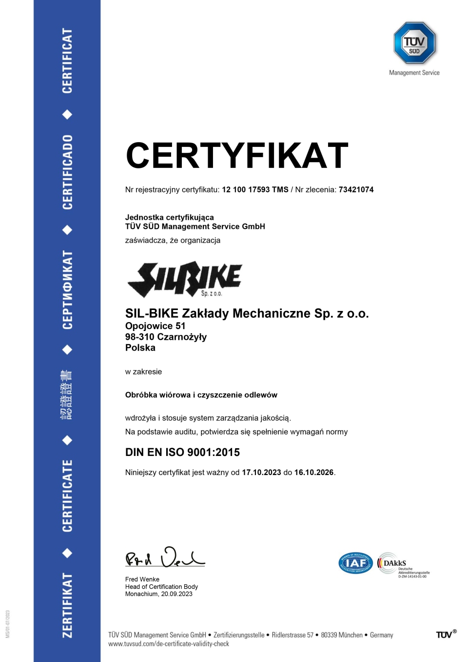 Certyfikat ISO 9001 - Zakłady Mechaniczne SIL-BIKE